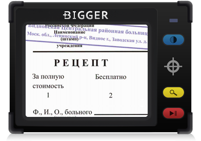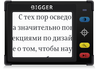 Большой экран цифровой лупы, на котором сразу можно прочитать целое слово, увеличение до 48х, вывод изображения на внешний экран телевизора или монитора - вот те функции электронных увеличителей Bigger для слабовидящих, которые сделают чтение даже длинных повестей и романов приятным занятием.